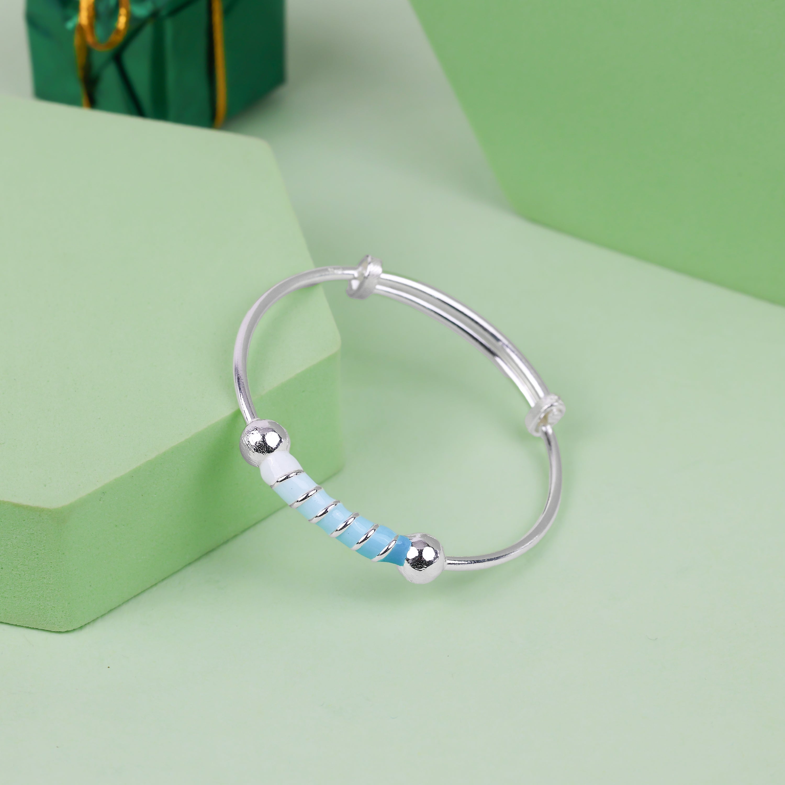 Calm and charming, the Ocean Bead Baby Adjustable Kadli is designed to bring a soothing touch to your little one’s wrist. Featuring soft blue and aqua-toned enamel beads paired with a polished silver finish, this kadli reflects gentle ocean hues that feel peaceful and playful.