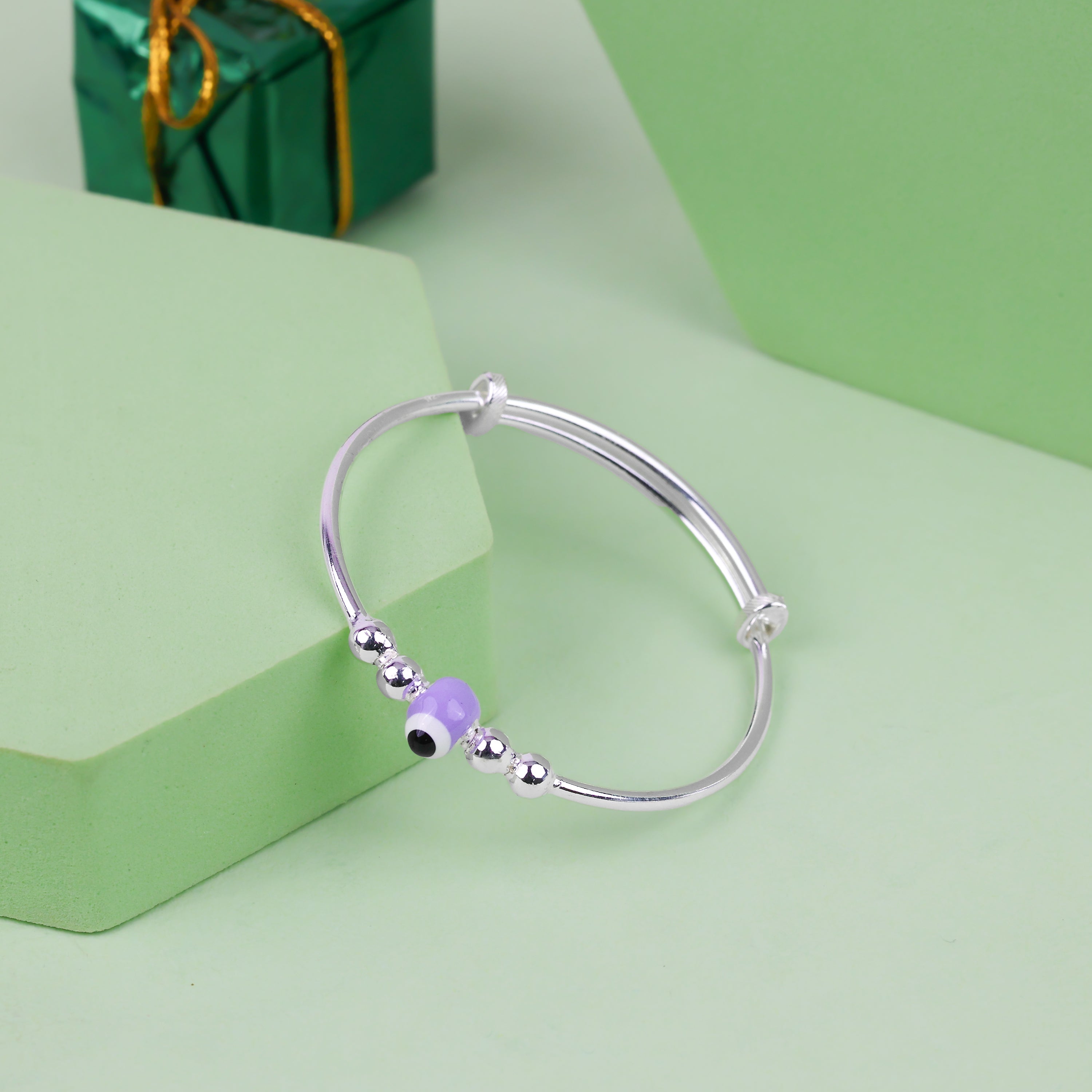 Gentle and protective, the Purple Nazar Baby Adjustable Kadli features a soft purple evil-eye charm set among polished silver beads. Designed to symbolize care and protection, this kadli adds meaningful beauty while staying safe and comfortable for little wrists.