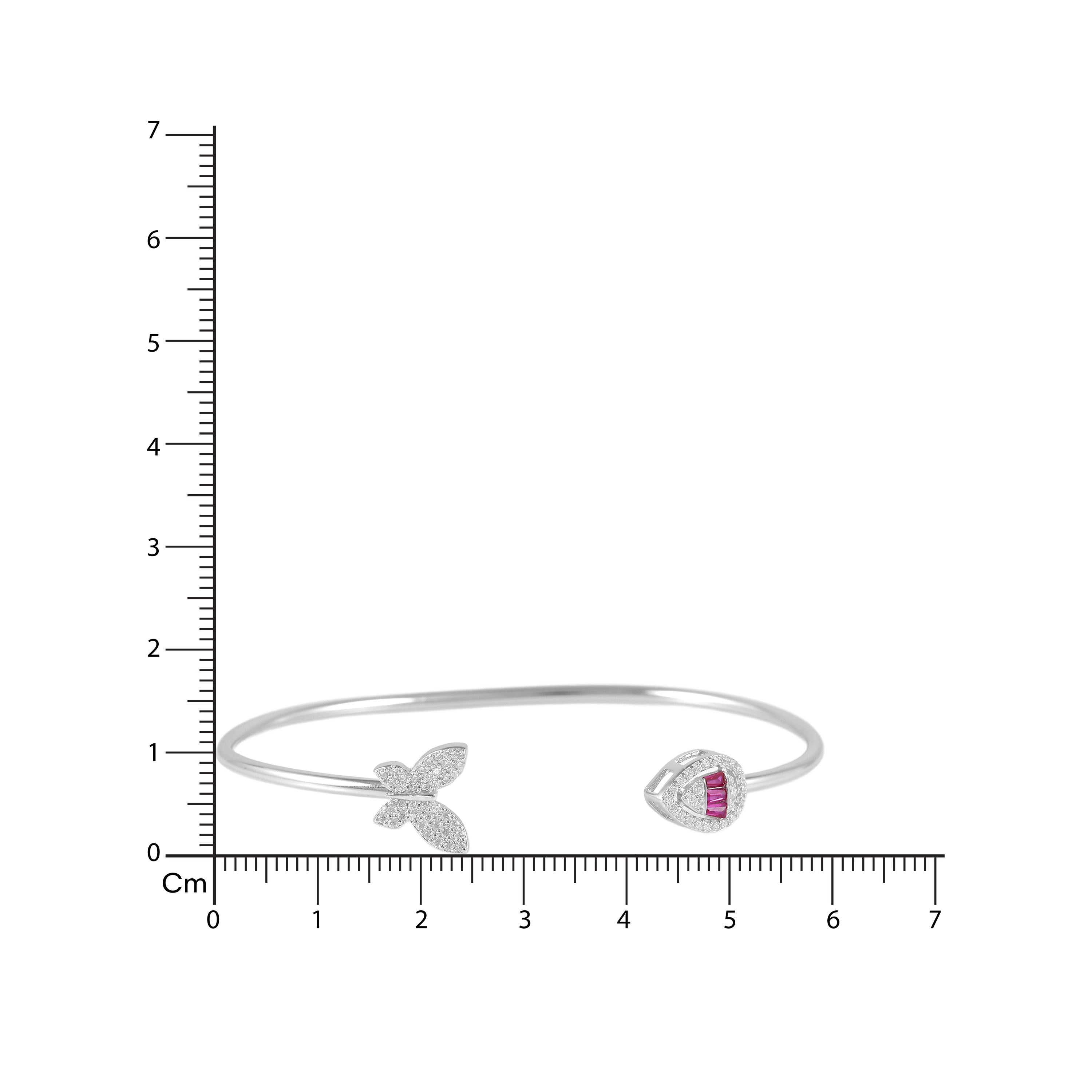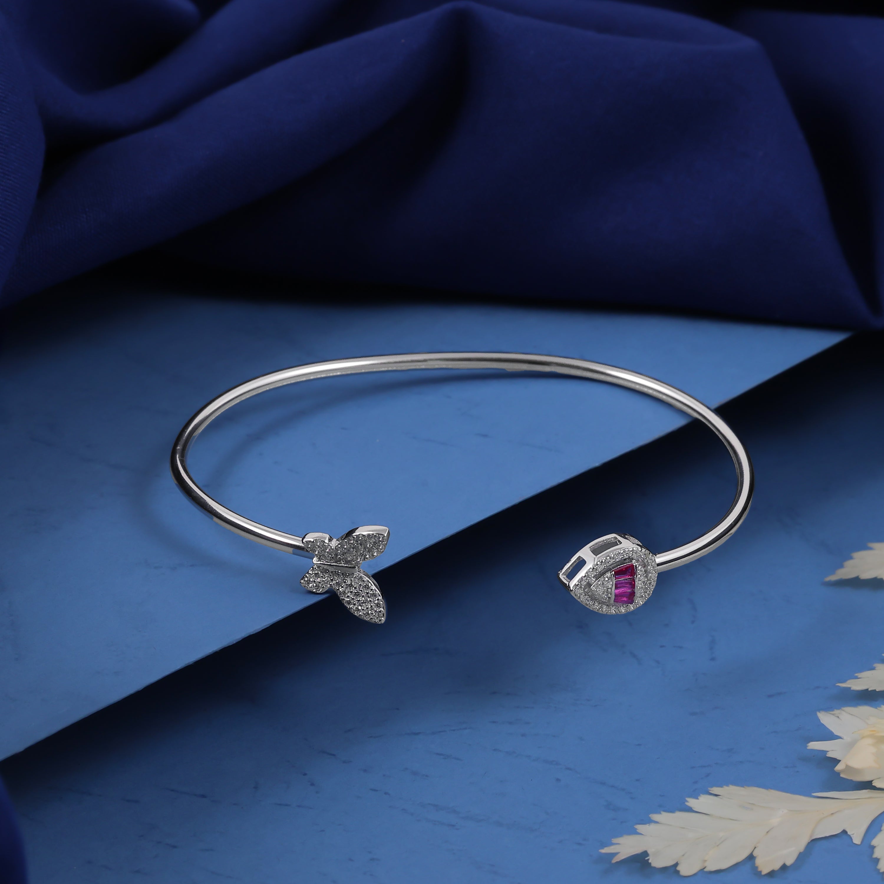 This open cuff bracelet is a beautiful dance between whimsy and sophistication! The delicate butterfly on one end and the vibrant ruby-studded teardrop on the other create a truly unique and enchanting piece.