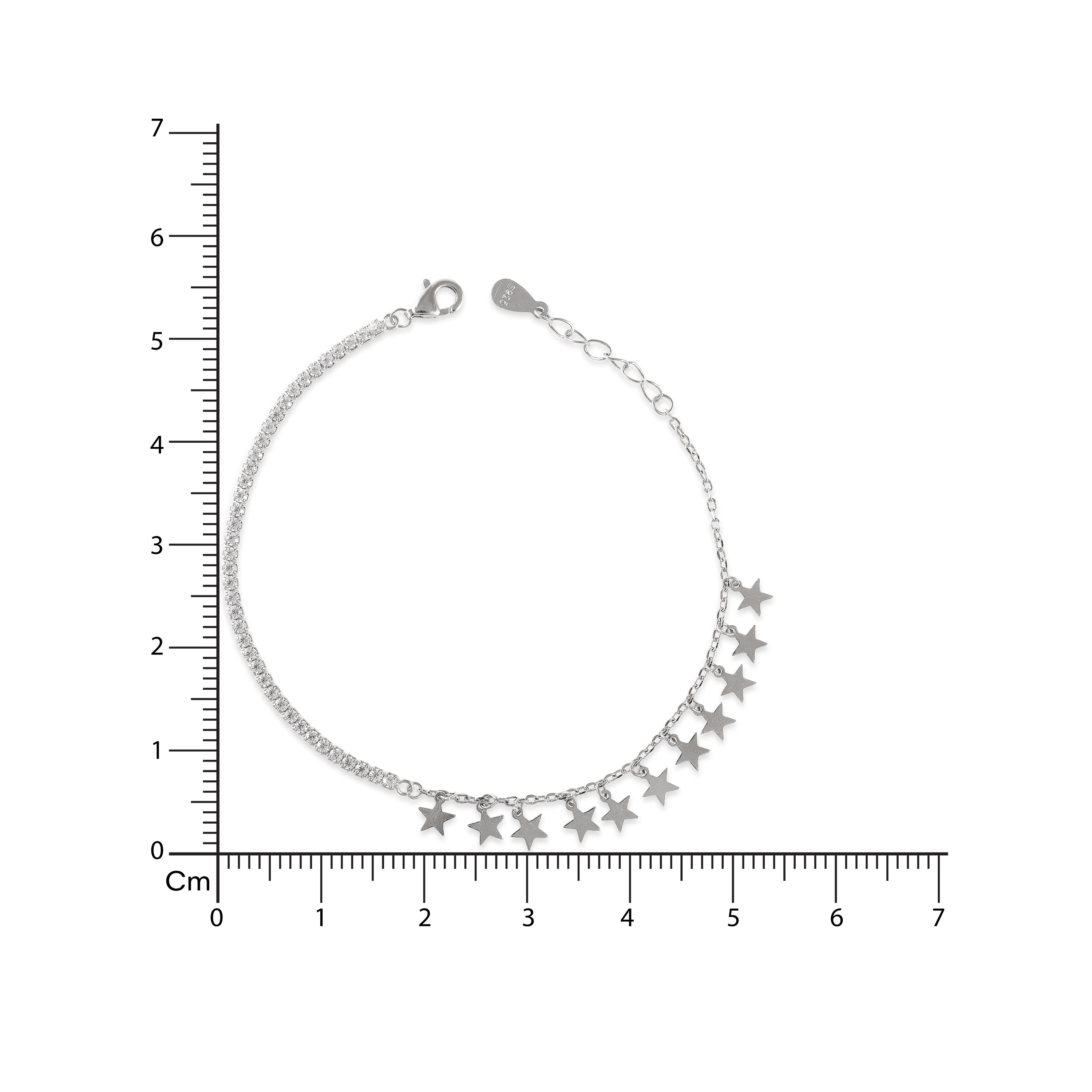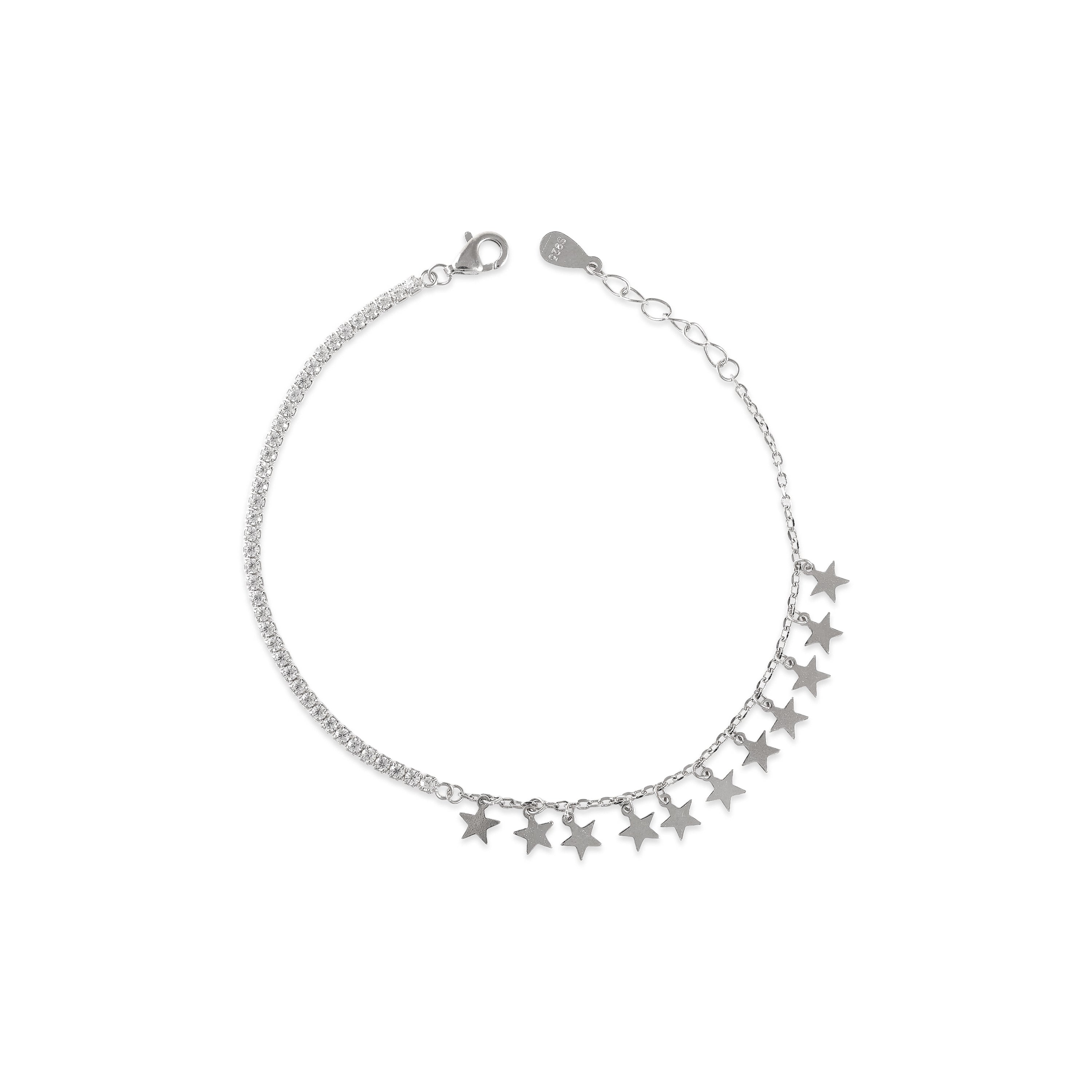 Emphasize the radiant line of crystals, creating a continuous band of brilliance that catches every light.Highlight the playful cascade of polished star charms, adding whimsical movement and a touch of celestial magic.