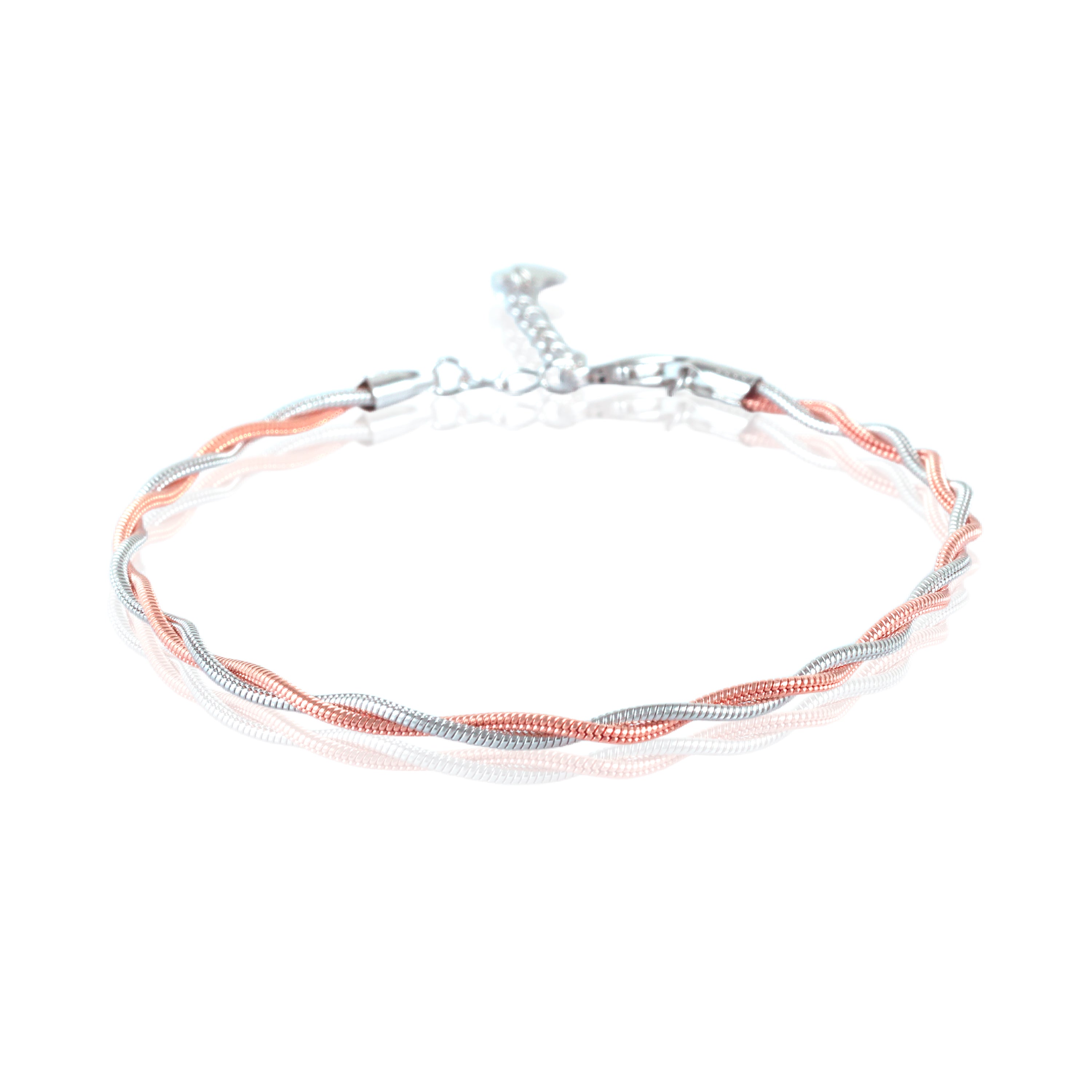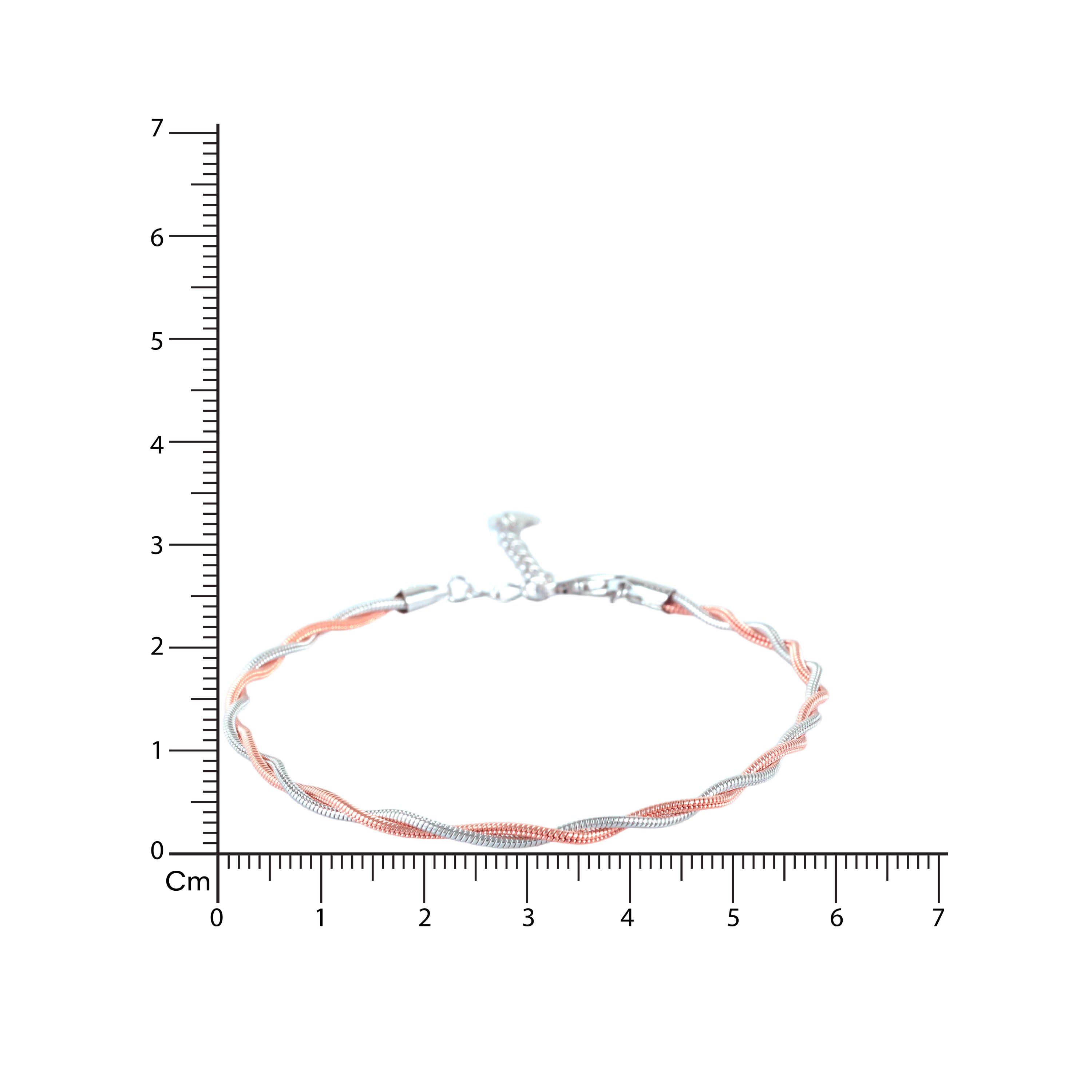 Emphasize the beautiful blend of silver and rose gold, creating a dynamic, twisted design that catches the eye.Focus on how the two metals complement each other, offering versatility to pair with any outfit or other jewelry.