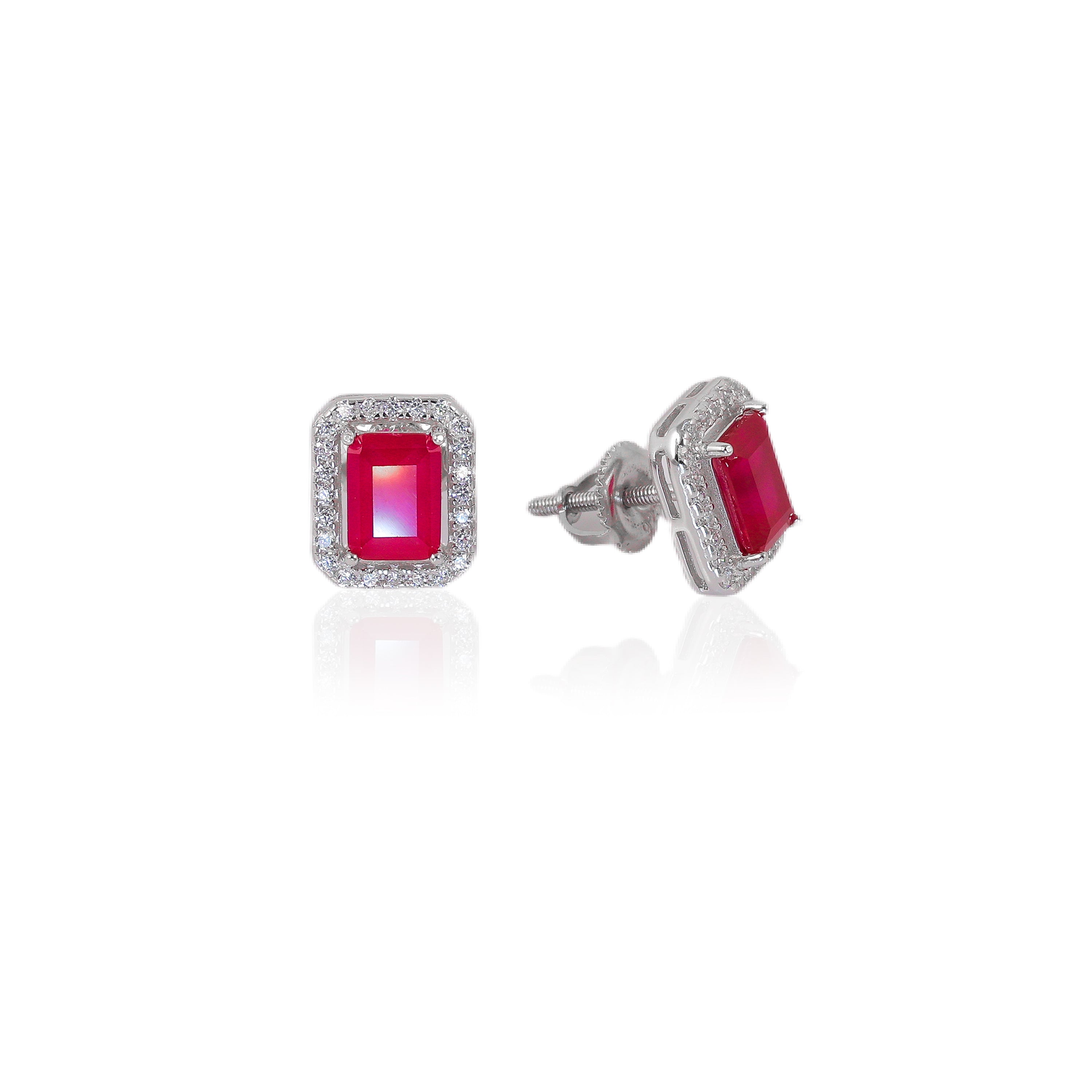 A vibrant, rectangular ruby, radiating deep, captivating red.Framed by a brilliant round diamonds, enhancing the red rich hue.