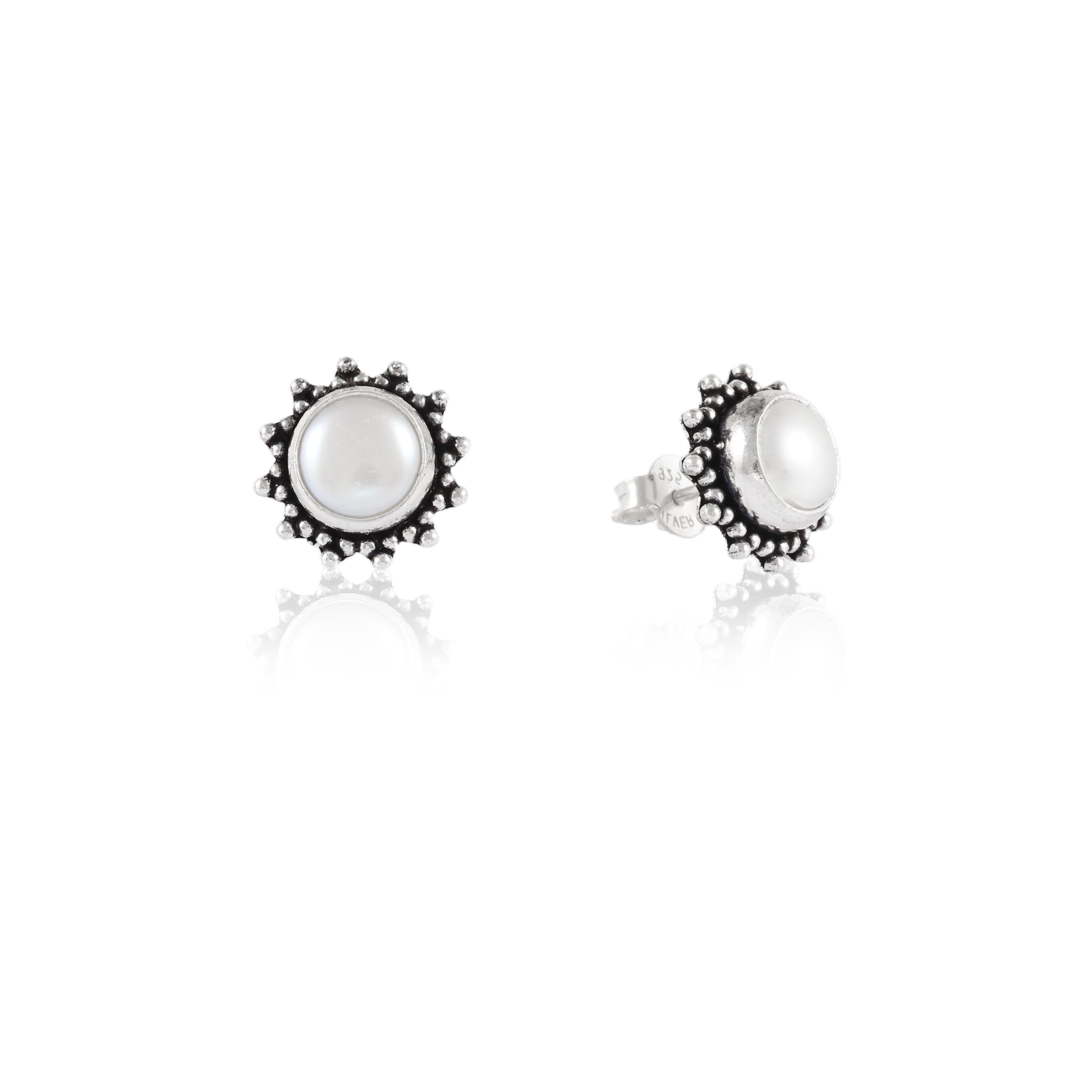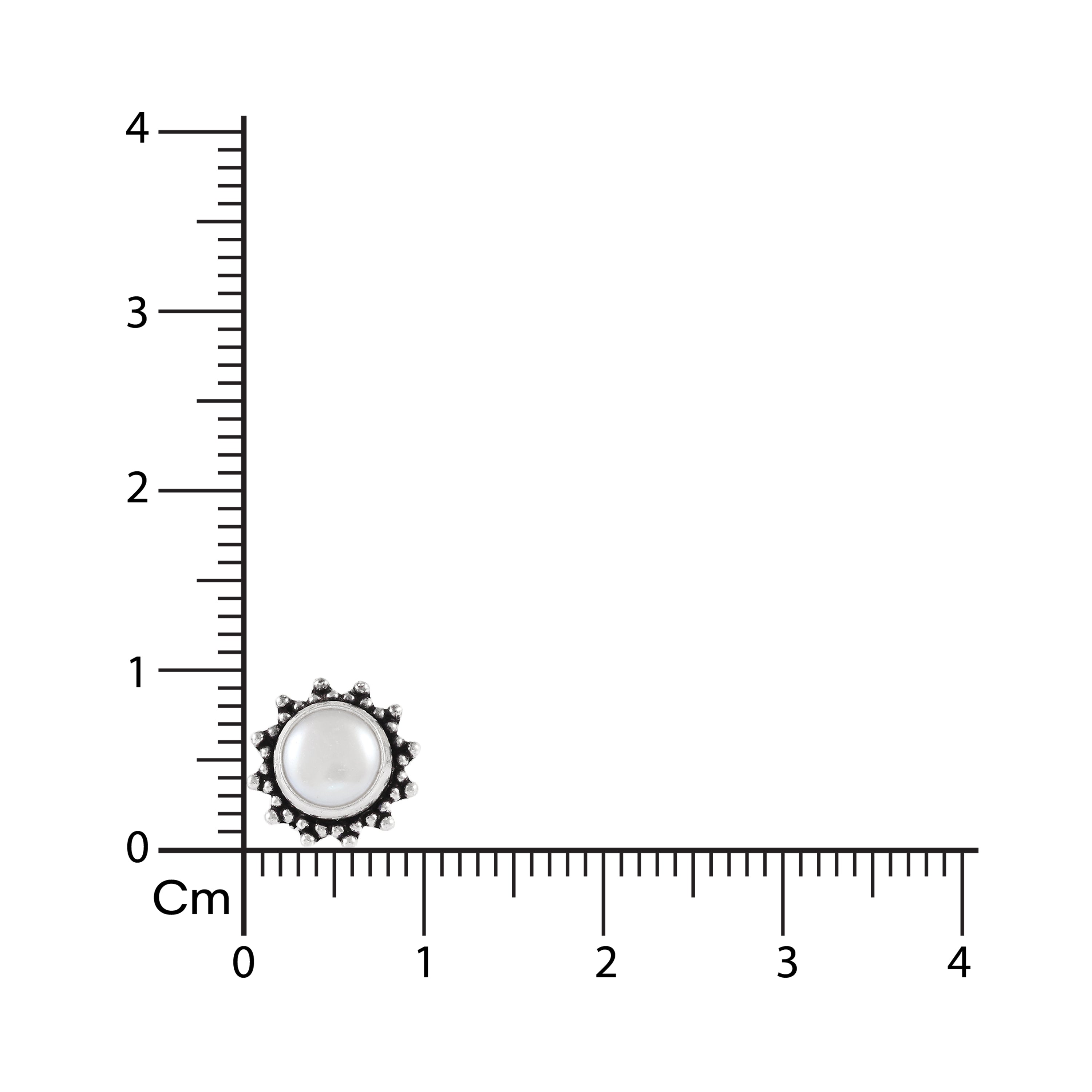 A smooth, luminous round pearl, radiating a soft, classic glow. Encircling the pearl is a textured halo of intricate milgrain detailing or small, spherical metal beads, creating a sunburst or floral-like frame.