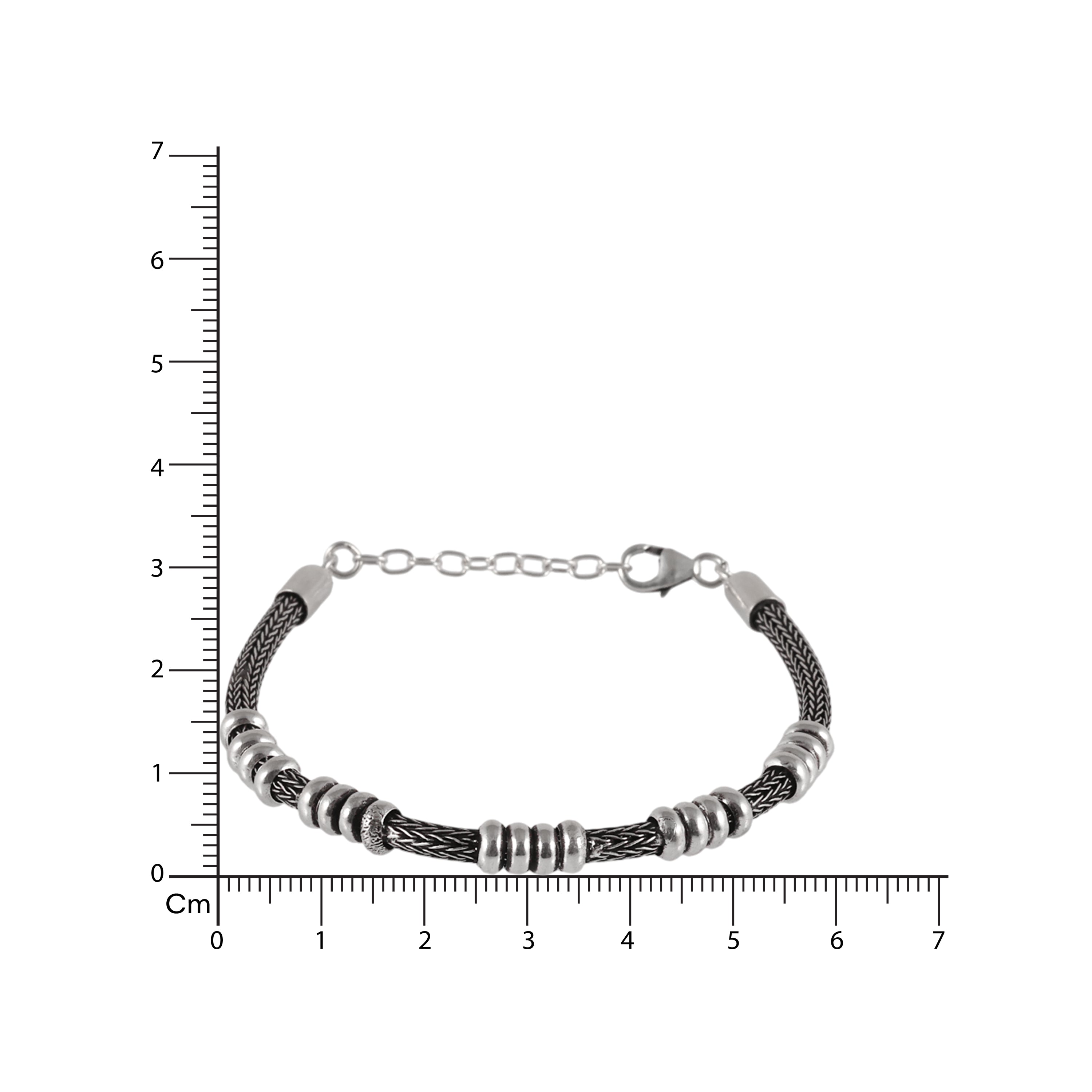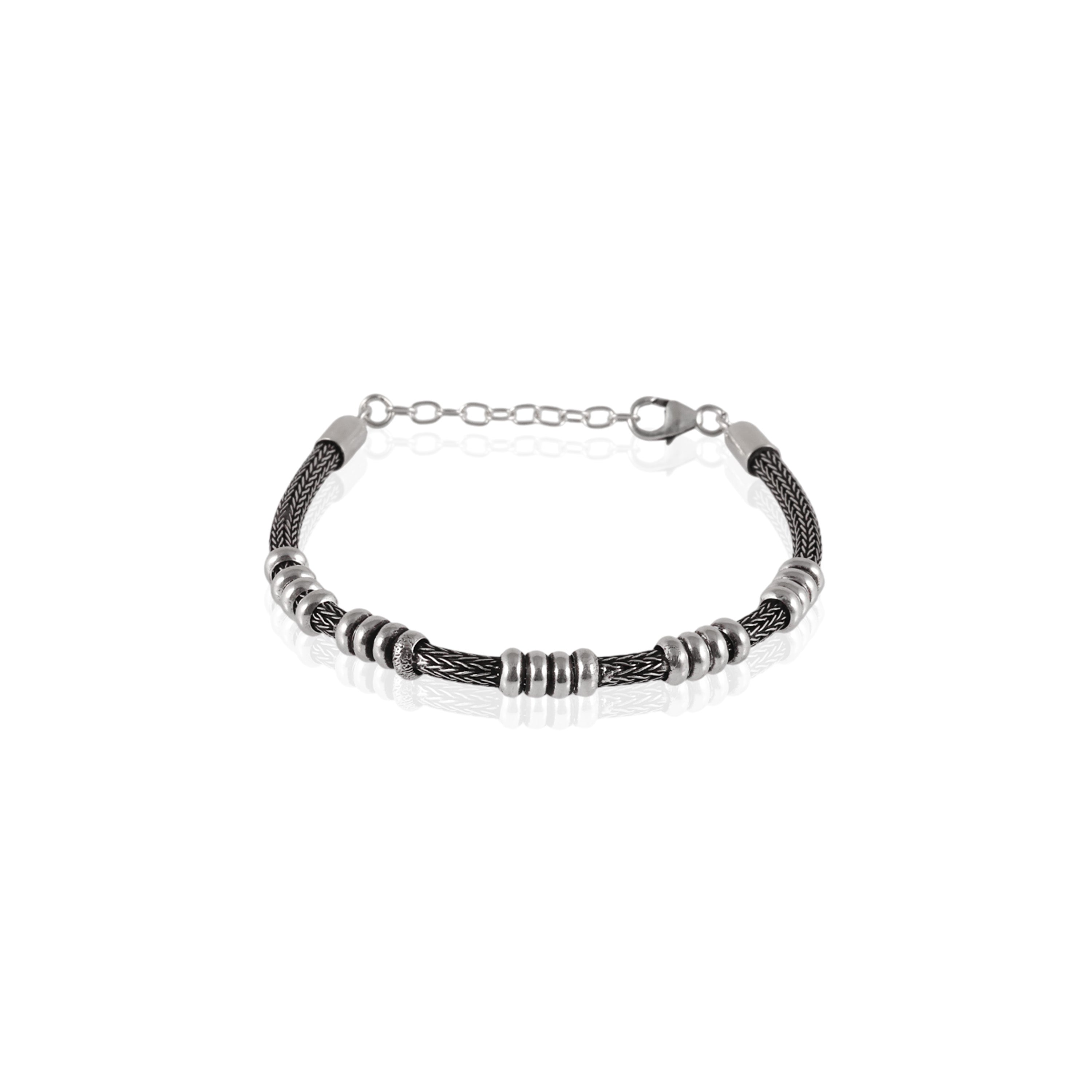 The Iron Coil Bracelet is built with intention. A tightly braided dark cable forms the core, accented with polished silver rings that add rhythm, weight, and texture. Finished with an adjustable chain clasp, it balances raw strength with everyday wearability.
