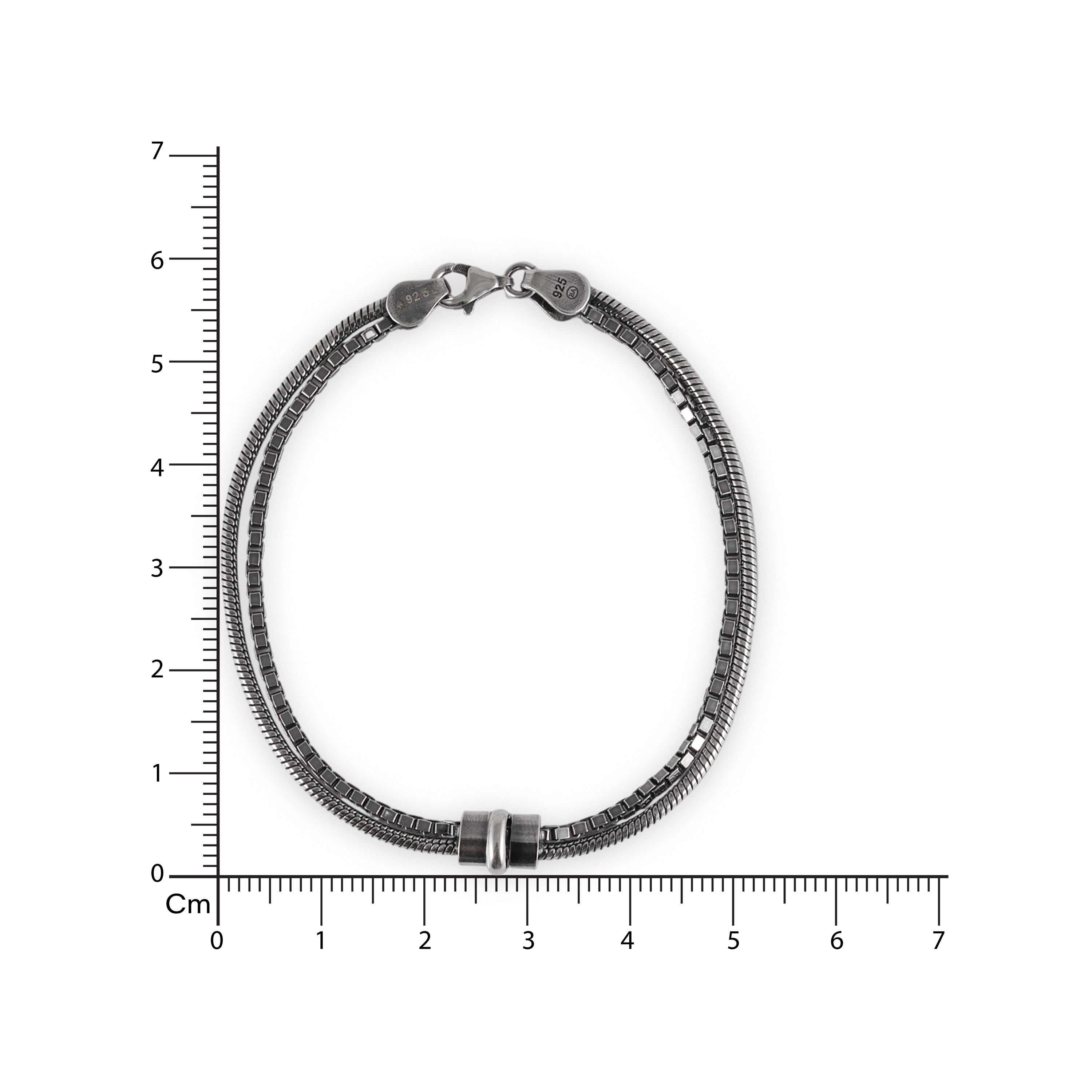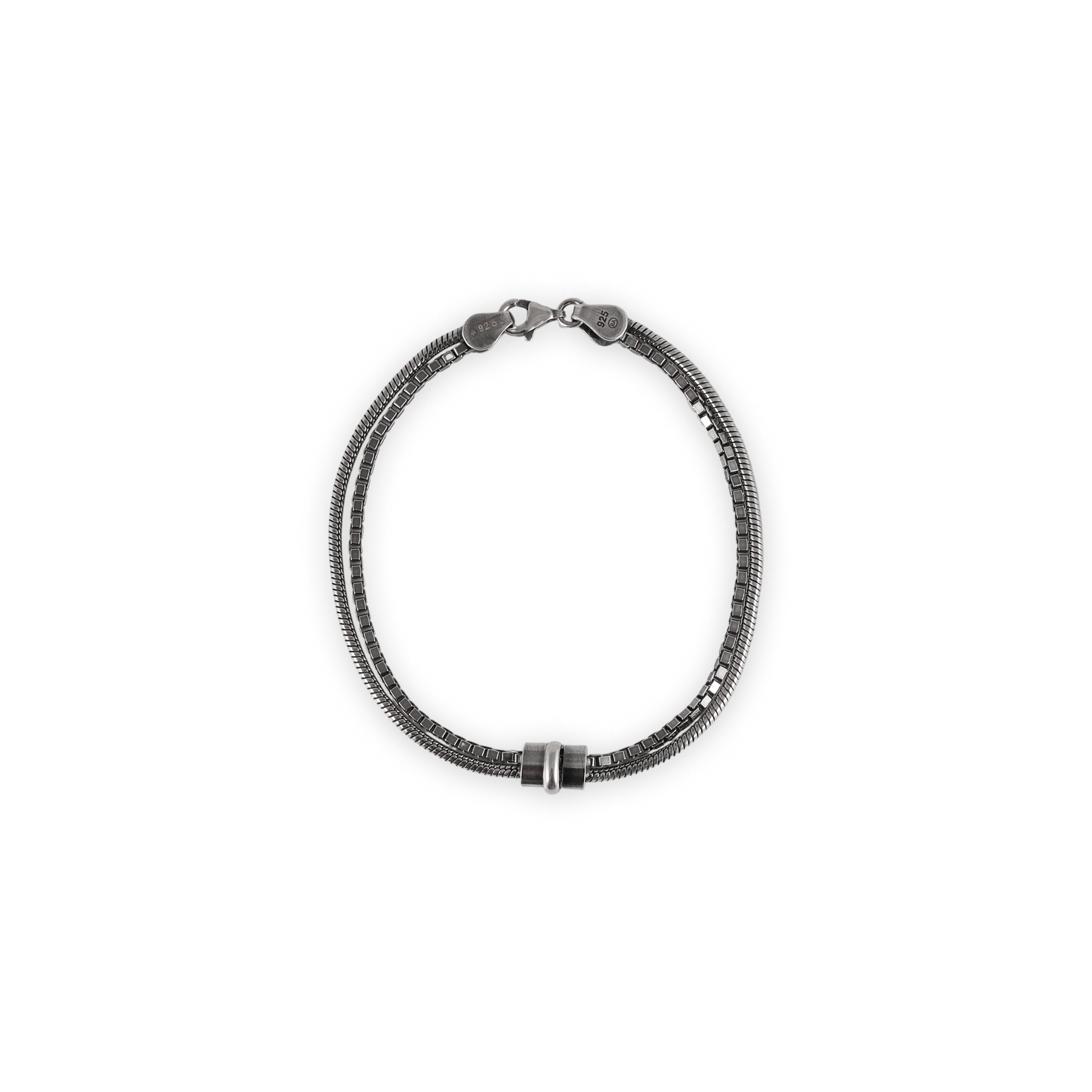 The Dual Current Bracelet is built on balance. Two distinct chains run in parallel, united by a central metallic accent that anchors the design with quiet authority.