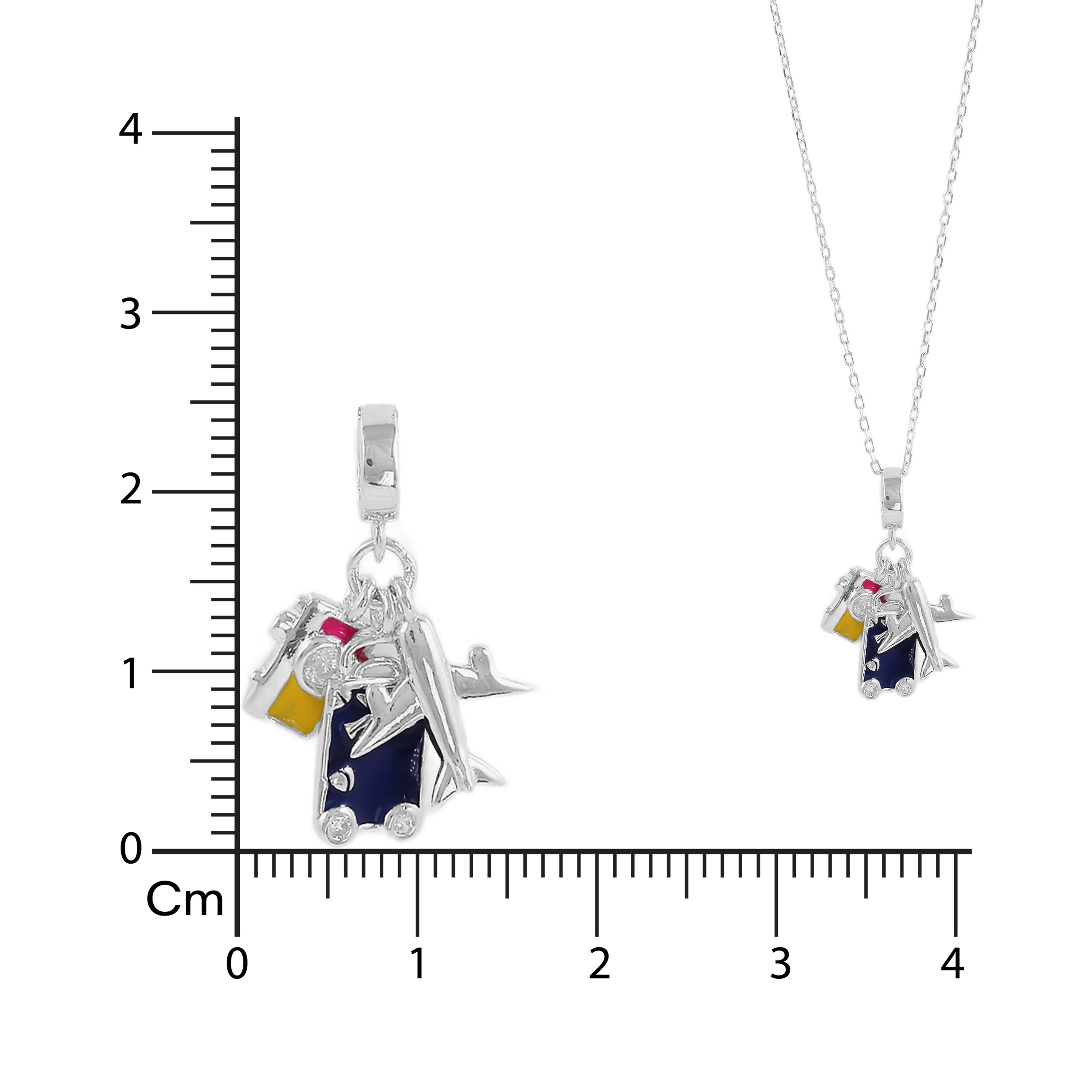 A polished silver necklace featuring a cluster of miniature charms, including a tiny airplane, suitcase, and globe, designed with multicolored enamel accents for a playful travel theme.