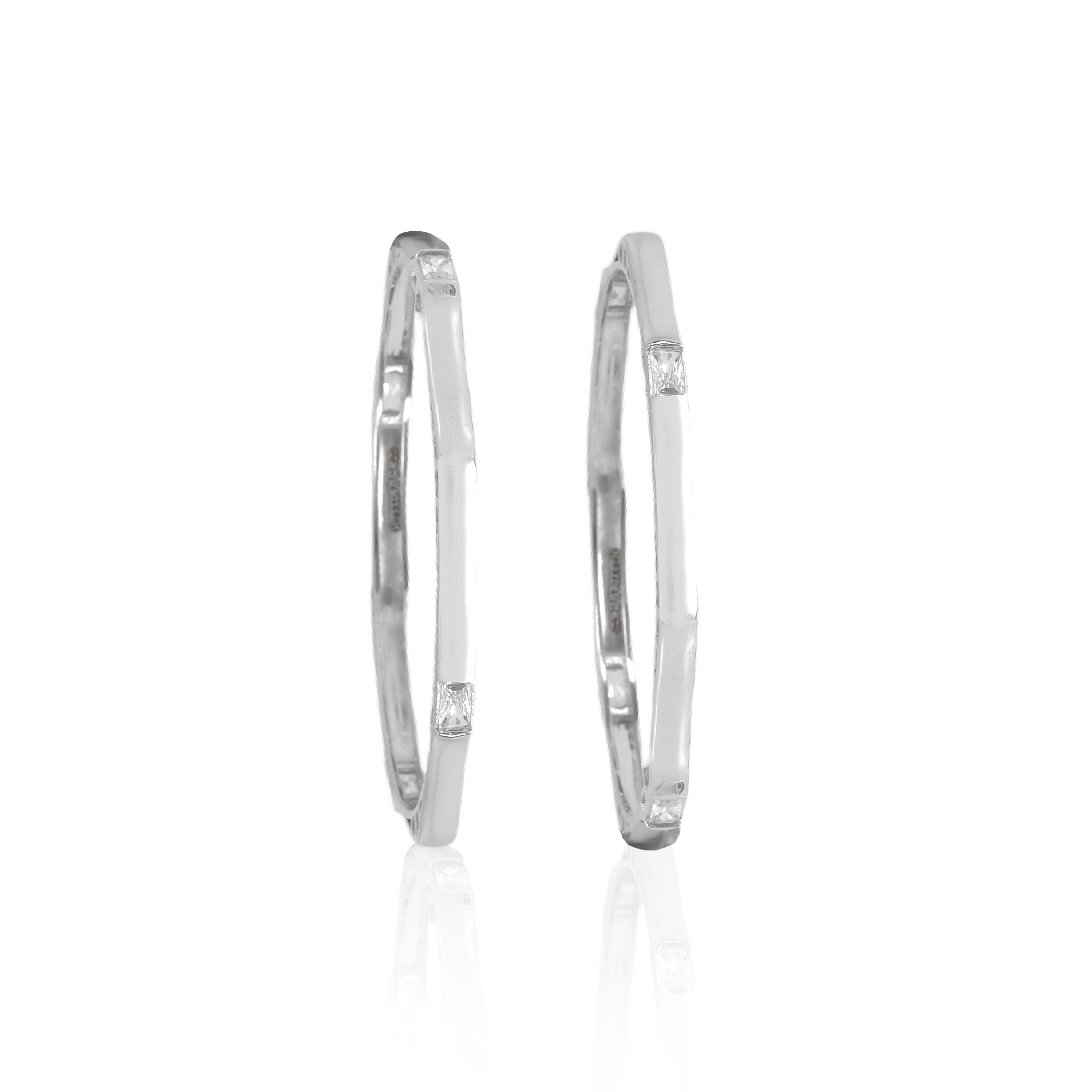 Highlight the crisp,square-cut stones. Emphasize their clear brilliance against the metal.Focus on the clean lines and polished finish of the silver. It's a contemporary twist on a classic.