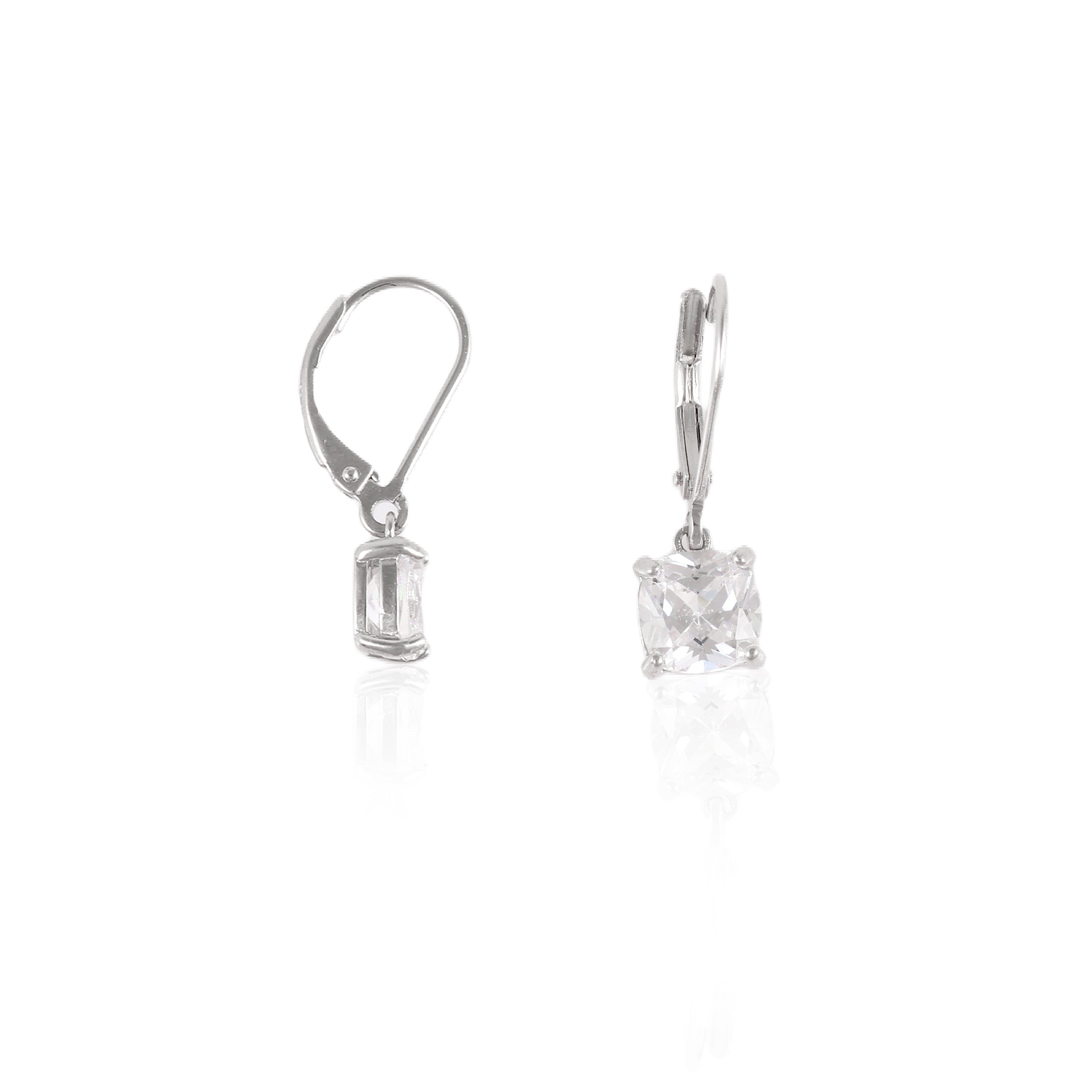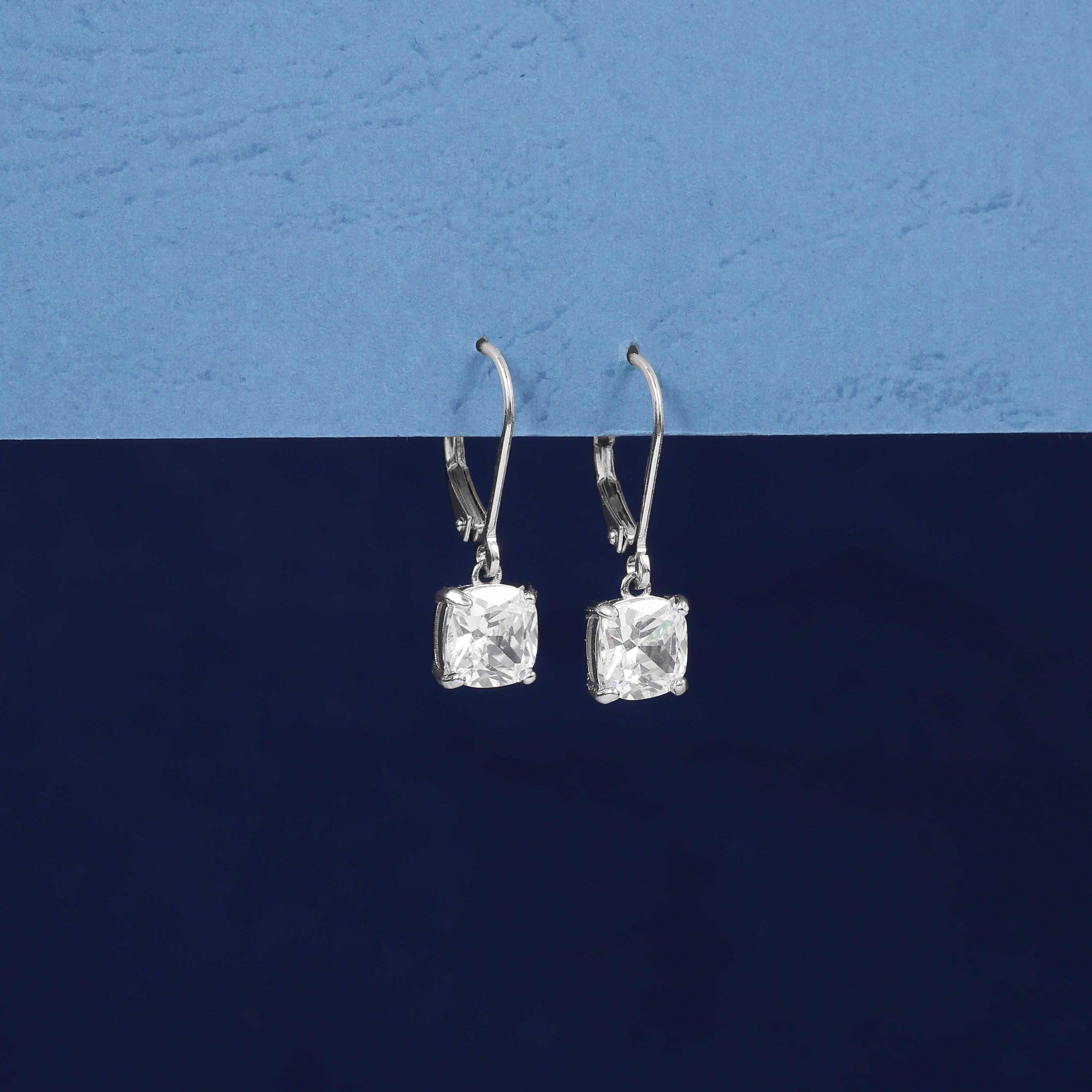 A striking pair, featuring mismatched yet complementary clear, faceted stones – one a sophisticated rectangular baguette cut, and the other a radiant cushion or princess cut.