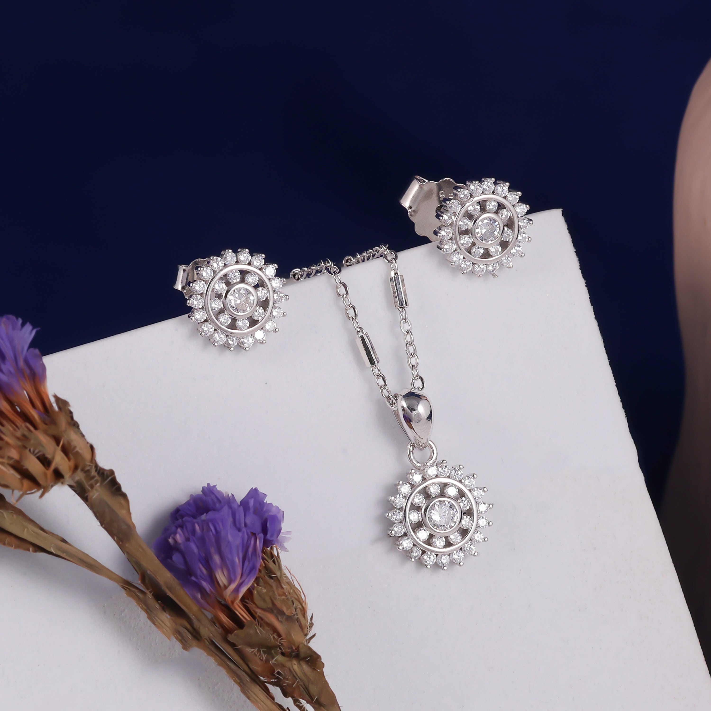 This is a coordinated sunburst, mandala, or floral-inspired jewelry set, featuring a pendant and matching stud earrings.