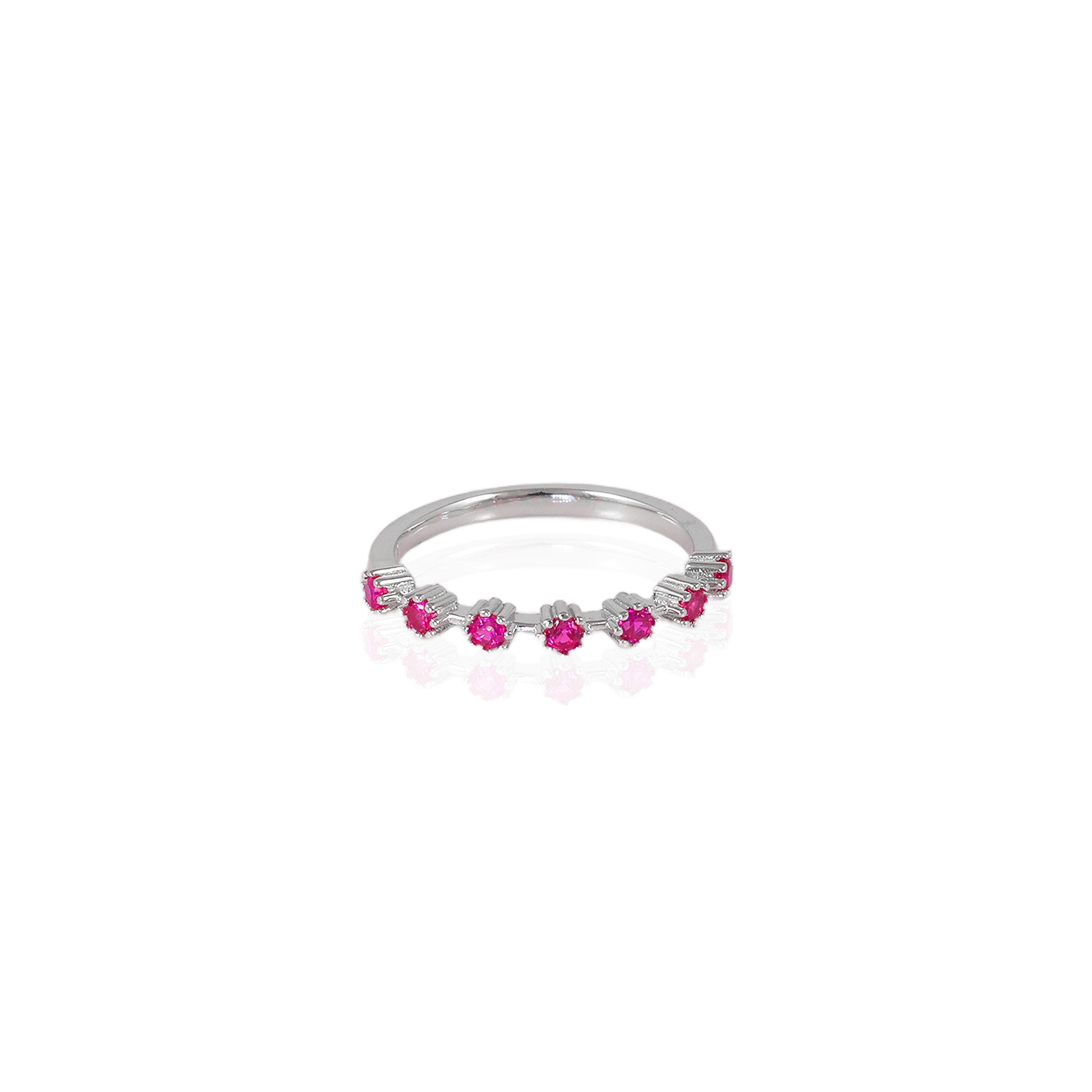The ring features a row of uniformly sized, vivid pink round brilliant-cut gemstones.