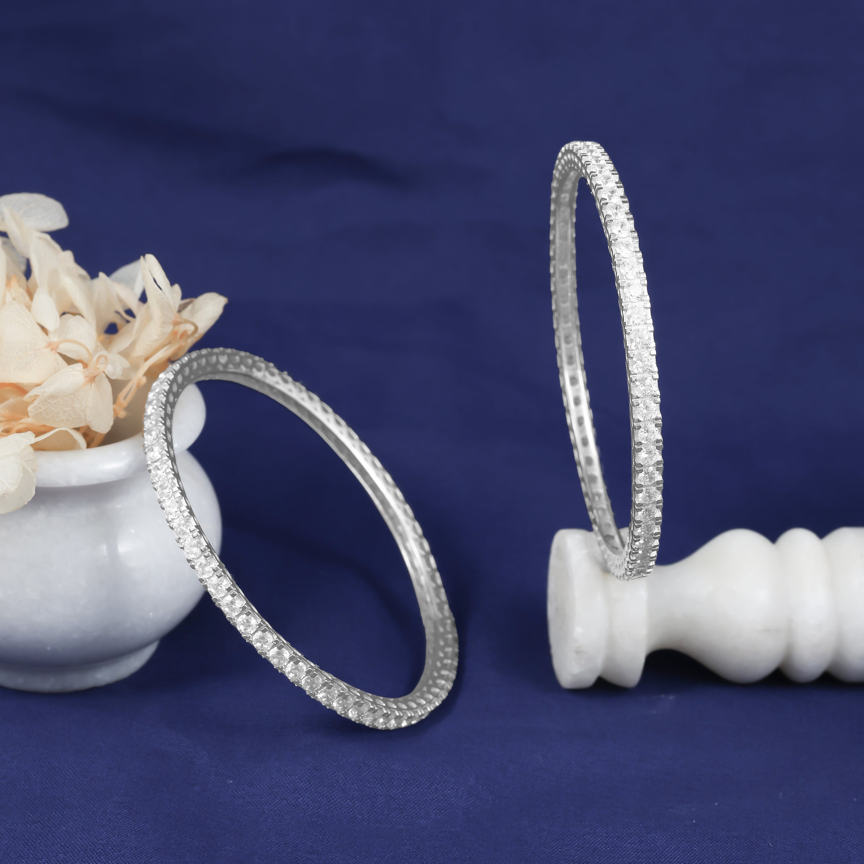Each bangle is completely encircled by a continuous line of brilliant, round, clear stones.The stones are meticulously set, likely in a shared-prong or bezel style, maximizing their light return and creating an uninterrupted flow of brilliance.