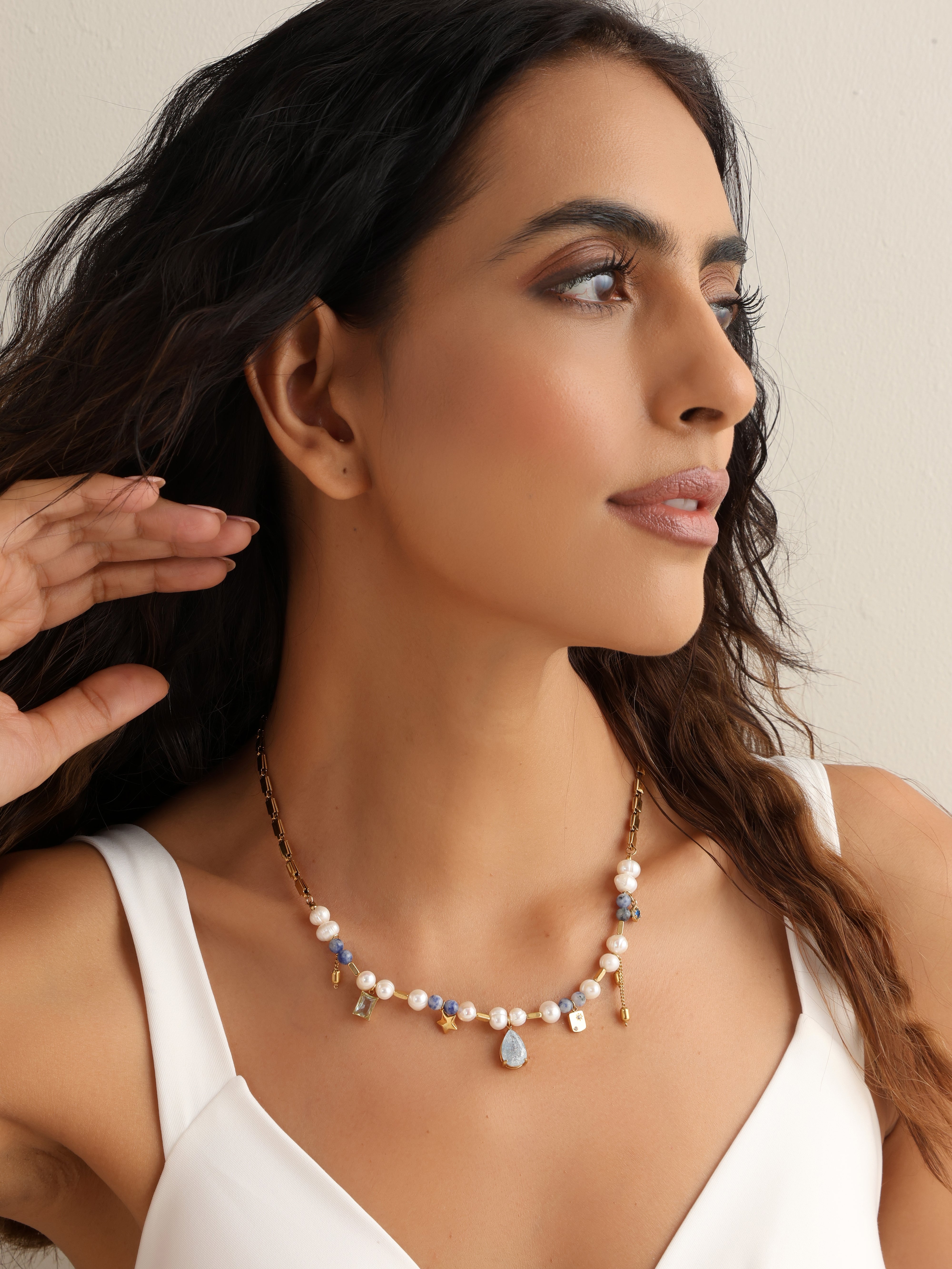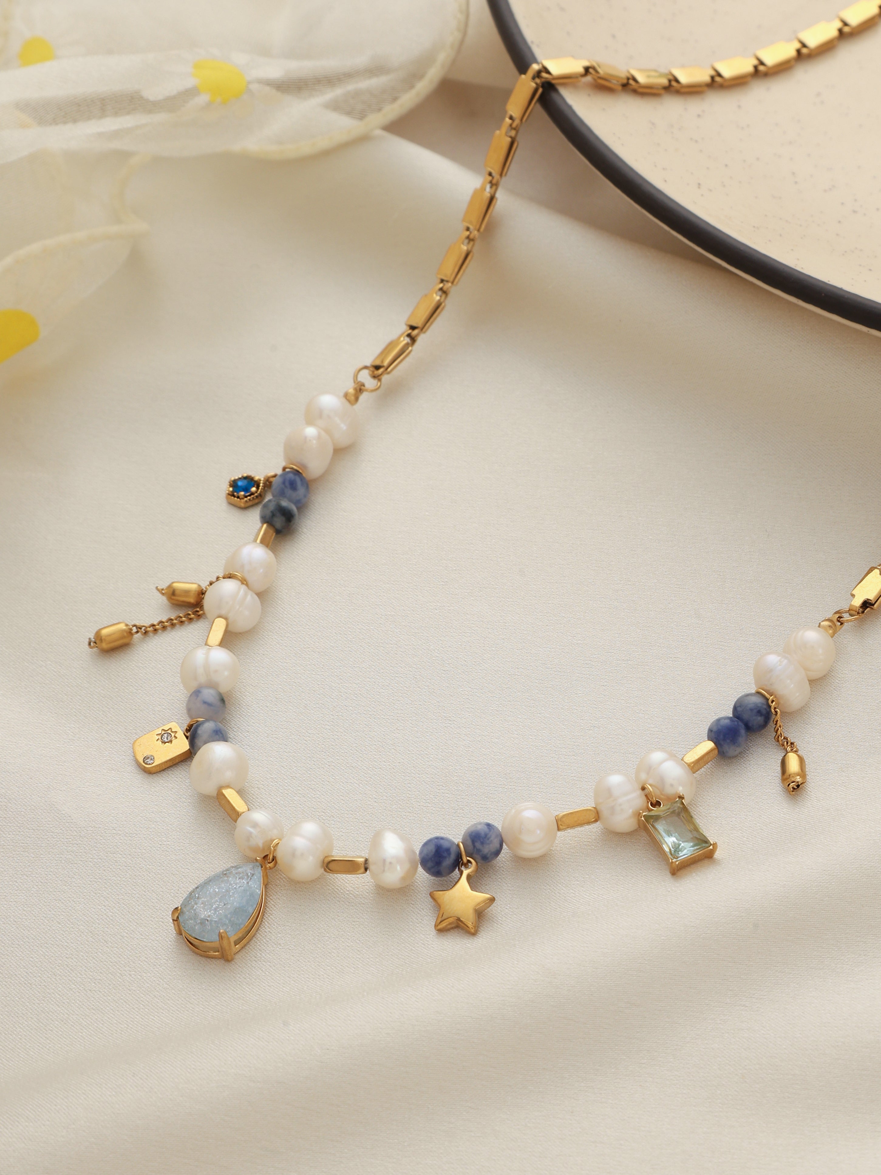 Introducing ourBlueOcean Fresh Water Pearl Necklace!Made with real fresh water pearls and natural stones, this waterproof jewelry piece is perfect for adding a touch of elegance to any outfit. Dive into style with this must-have accessory!